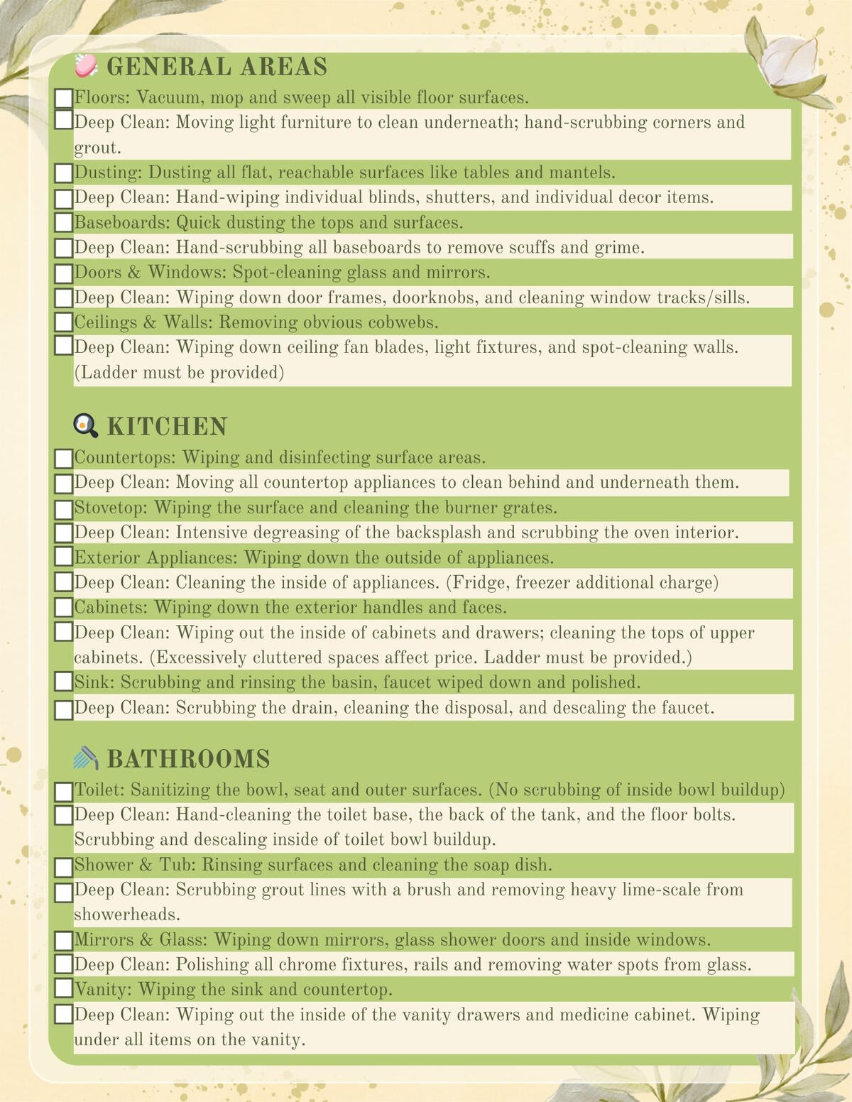 Deep Clean: Wiping down door frames, doorknobs, and cleaning window inside and out.Ceilings & Walls: Removing obvious cobwebs.