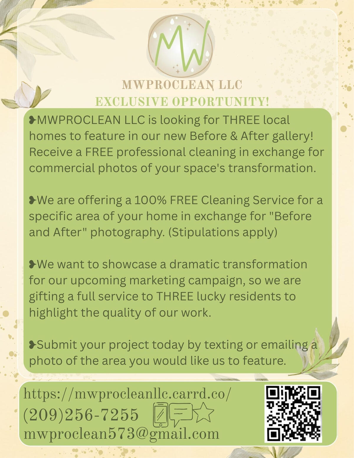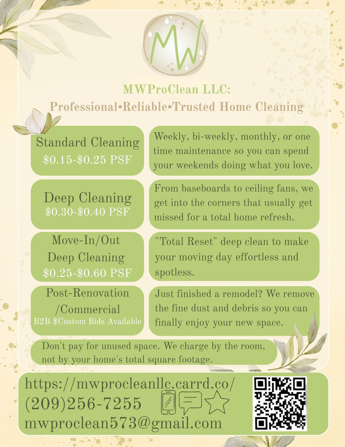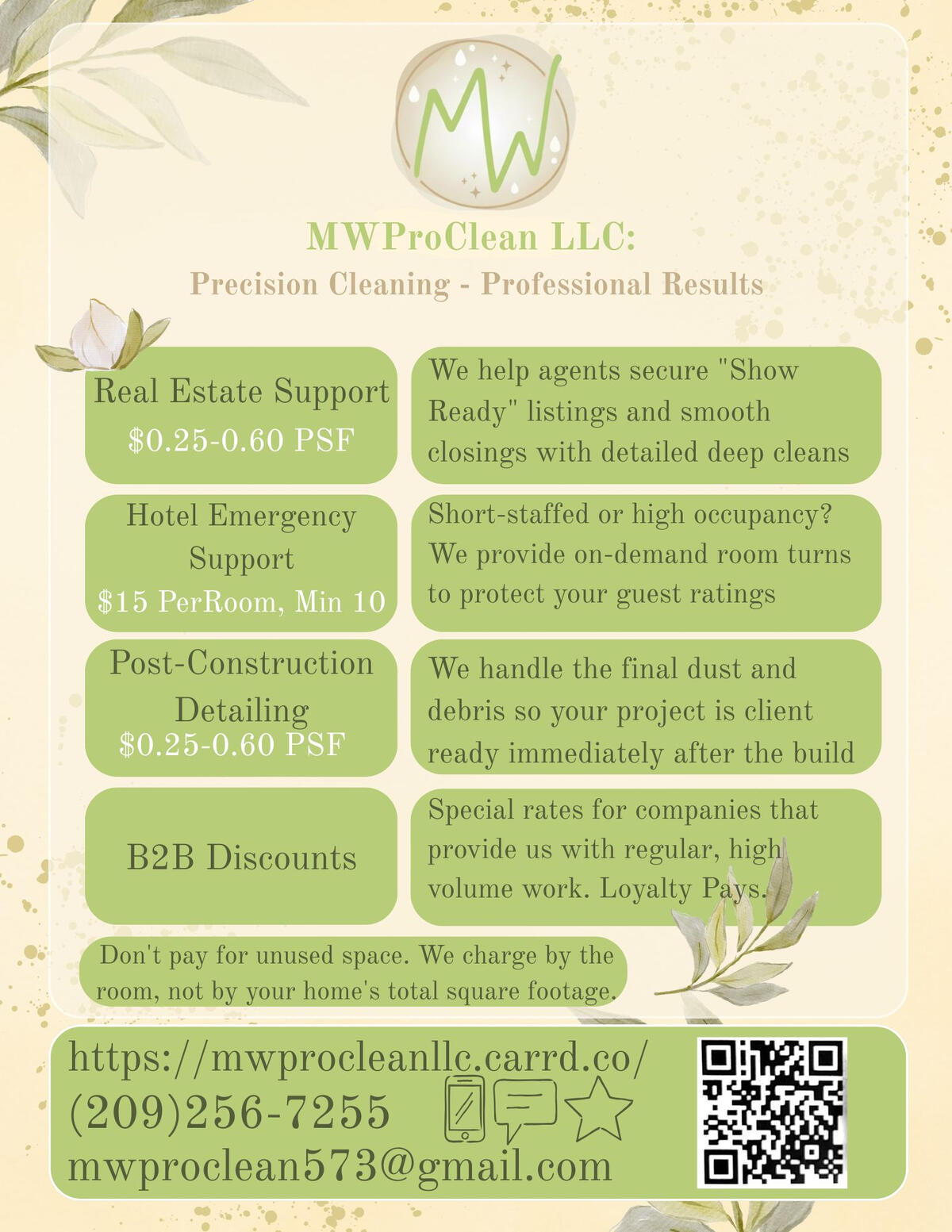At MWProClean LLC, we specialize in professional move in/move out cleaning designed to get properties Market Ready and looking their absolute best for photos, showings, and new owners. We understand that in real estate, first impressions are everything, and we provide the reliable, high standard detailing needed to help you close the deal.Exclusive B2B Partner Benefits: We offer specialized pricing and flexible scheduling for Realtors, Property Managers, and Investors looking for a consistent cleaning partner.The "Double Special" Bundle: Save 40% OFF our standard rates ($0.25PSF) when you book a bundle of two houses (Level 1 Condition).Customizable Service Scope: We work with your budget. We can reduce or adjust specific tasks within a general clean to help you hit a specific price point.Flexible Pricing: Individual jobs are priced competitively at $0.25-$0.60 PSF based on the home's condition level and whether you require a General or Deep Cleaning.Professional Reliability: We offer free on site walkthroughs and customization to ensure the service fits the property’s unique needs.$100.00 minimum applies for all jobs. Let us handle the "dirty work" so you can focus on the sale. Contact us directly through our online business card for a free quote or to discuss your next listing: