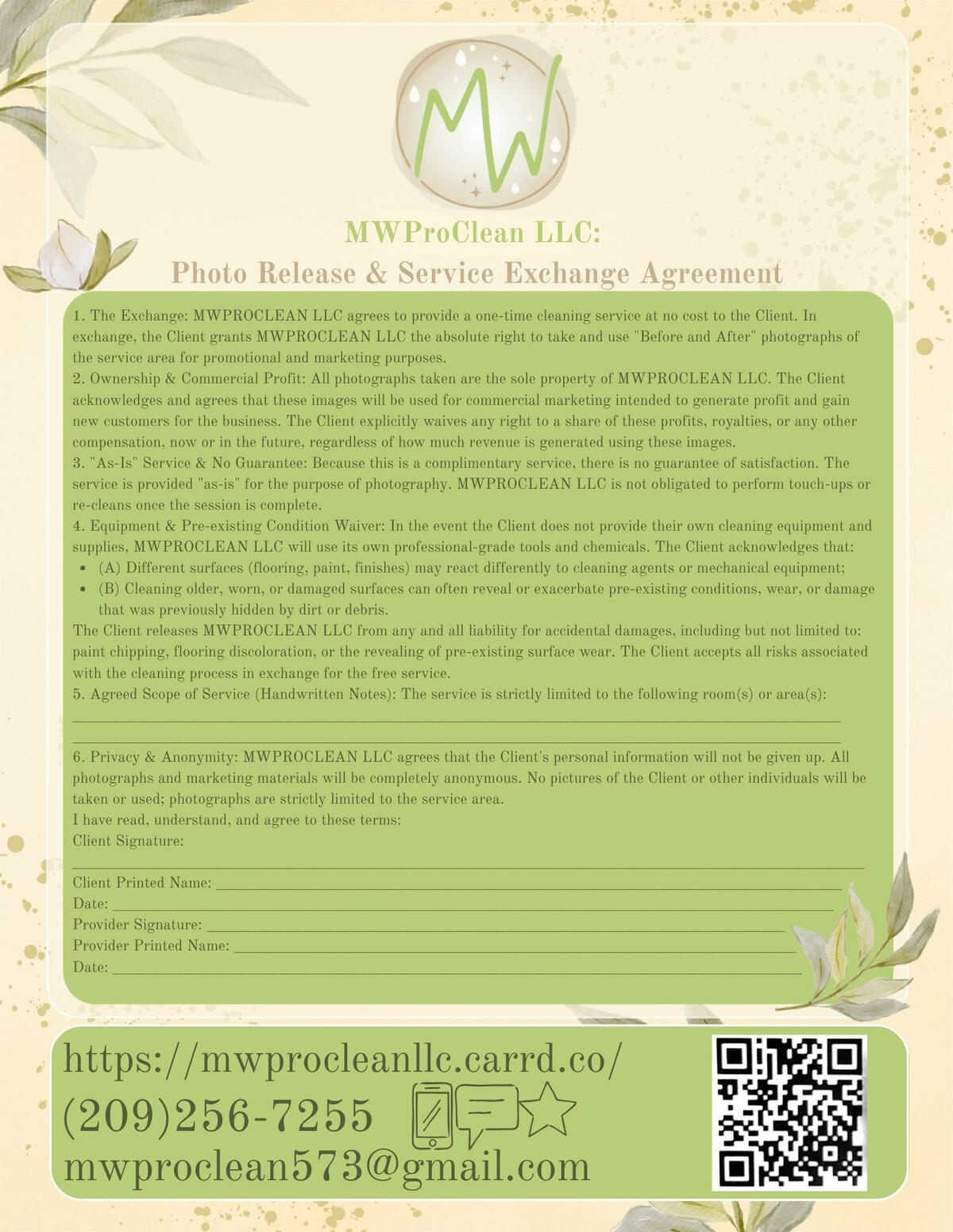 MWPROCLEAN LLC agrees to provide a one-time cleaning service at no cost to the Client. In exchange, the Client grants MWPROCLEAN LLC the absolute right to take and use "Before and After" photographs of the service area for promotional and marketing purposes.