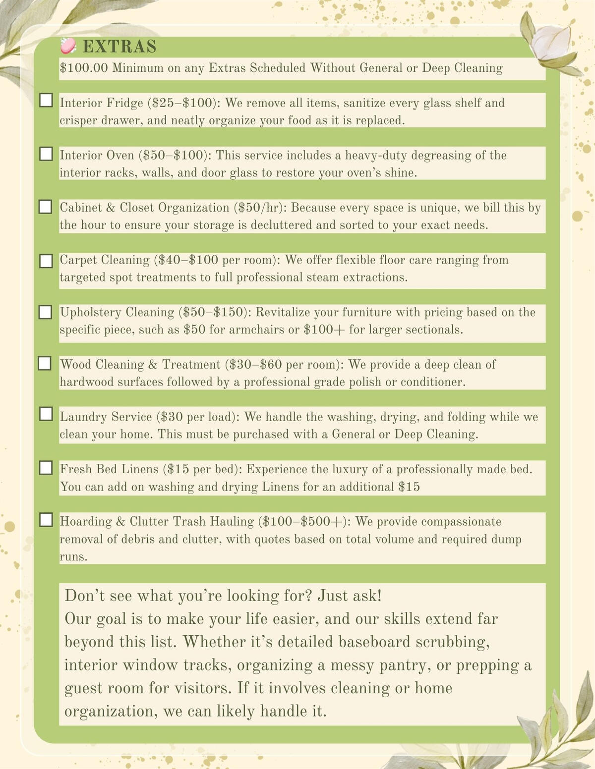 Deep Clean: Cleaning the inside of appliances. Fridge, freezer, small oven like appliances is an additional charge.Cabinets: Wiping down the exterior handles and faces.